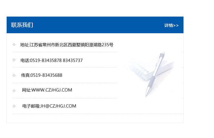 地址:常州市新北區友邦商務大廈1幢16、17層  電話:0519-85101652  傳真:0519-85112595  郵編:213022  網址:www.cz-jiayue_cn.hsjinghua.com  郵箱:xiajifengaa@163.com